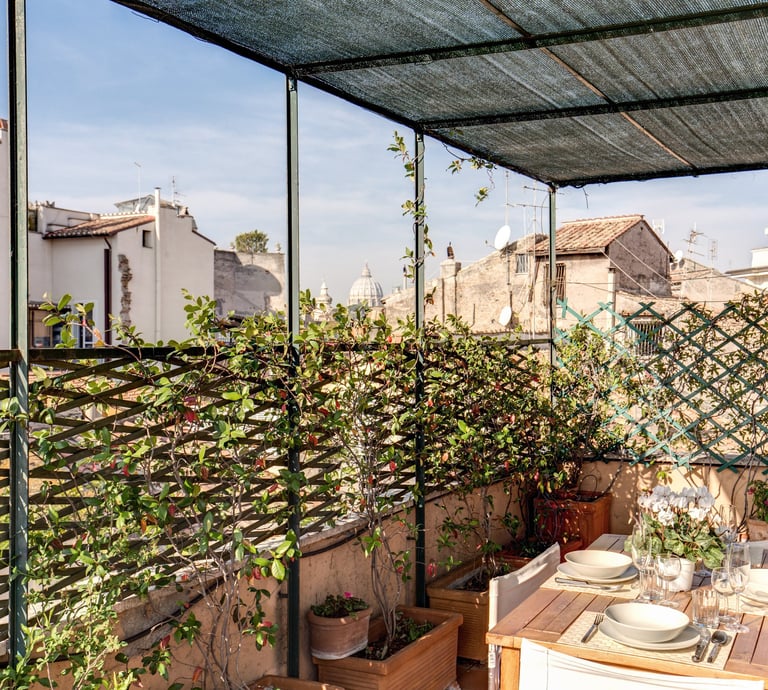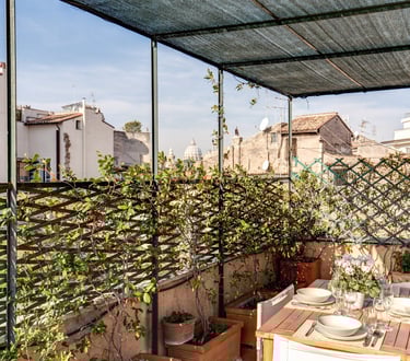 Un’oasi di pace nel cuore di Roma: attico e superattico in Via dei Cappellari, con una magnifica terrazza fiorita che regala una vista mozzafiato a 360°, da San Pietro alle cupole del centro storico.