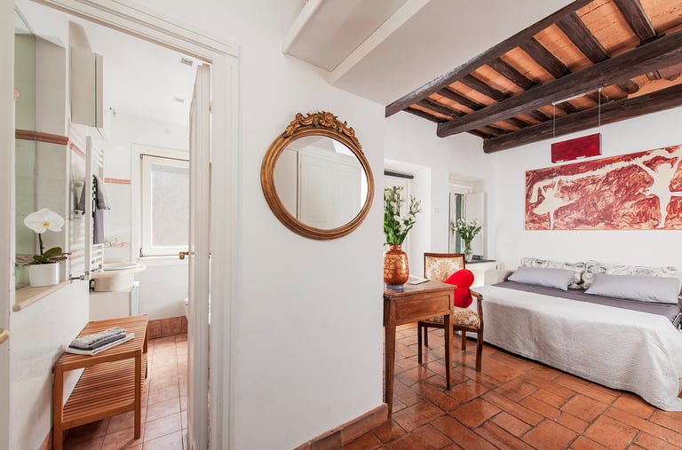 Un affascinante rifugio nel cuore di Roma. Nel centro storico, questa junior suite in una dimora del ‘500 ti accoglie con il suo fascino autentico. Composta da due ambienti comunicanti con arredi in stile provenzale e un bagno privato con doccia decorata con maioliche dipinte a mano.